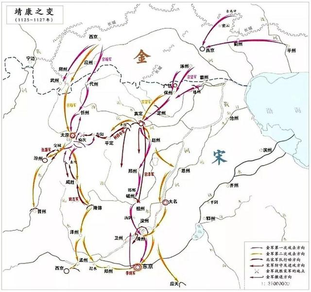 也就是说,金军在“靖康之变”发生的这一年,只抢了开封的财物和部分人口(主要是皇族、官吏、工匠、女性),没有占领多少北宋的国土(太原是当年才被金军攻破,但早在一年前,已经割让给金国了)。