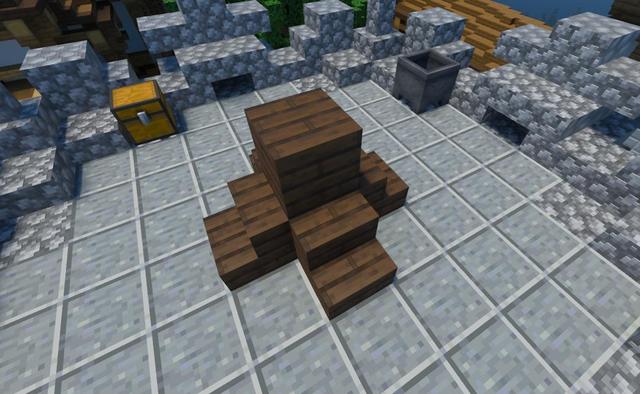 教程正式开始,首先我们需要用的深色橡木半砖、深色橡木、深色橡木活板门、深色橡木告示牌、深色橡木栅栏、深色橡木楼梯、深色橡木门、云杉木半砖、云杉木活板门、拉杆、磨石、铁链和铁砧。