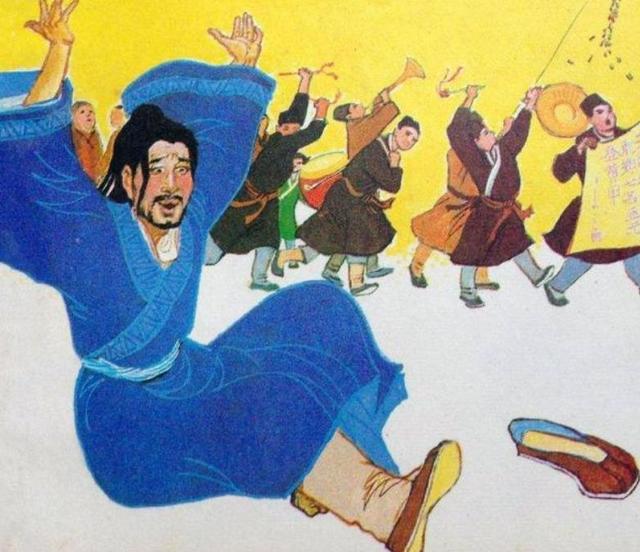 就这样范进 “抱着鸡,手里插个草标,一步一踱的,东张西望”,正在这时,中举的喜报传来。范进起初以为人们逗他玩,不信。得知是真的后,范进立刻就疯了。