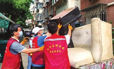 2020年6月,我市朝阳里社区志愿者正在清整社区环境卫生。