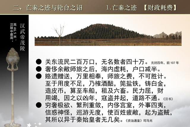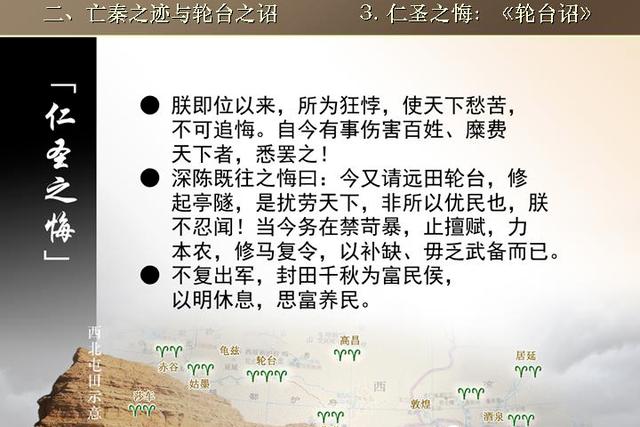 其实汉武帝对卫太子的守文路线不是完全否定的,他也希望在某个时候实行政策转变。尽管征伐有效,但汉武帝知道自己的某些作为是在袭亡秦之迹。随着时间的推移,面对着动荡凋敝的社会和困苦艰难的民生,汉武帝终于觉得镇压是无济于事的,最终决定转变方针。于是发布了一个著名的诏书——轮台诏。