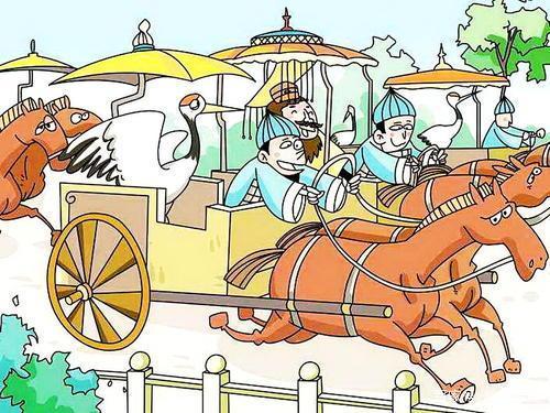 卫懿公是卫国第十八任国君,每天吃喝玩乐,不理朝政,他特别喜欢鹤,把鹤封为将军,还给它们俸禄,并按照鹤的身形和气质分成不同的级别,还配以相应的车辆。君王喜欢的东西大臣们就想方设法去弄,一时间卫国百姓都纷纷捕鹤,以供君王欣赏,而养鹤的费用也不断增加,只能增加百姓的赋税,弄得民不聊生。