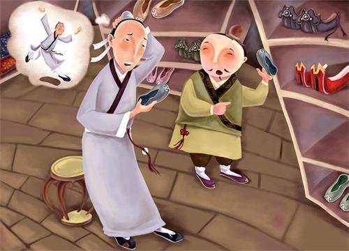 他在家中用量尺量好了脚的鞋码,不过当他去到集市的时候忘记带量尺了,他到了鞋贩子那里想要买鞋,一摸口袋,尺码没了,于是他就向老板说:“我尺码忘带了,我回家去拿。”于是他就回去拿鞋码去了,等到他返回时,鞋店已经关门了,这个郑国人也没有买到鞋。