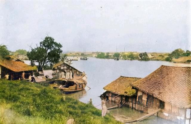 图为1933年的湘潭,数座房屋沿江而建,房屋门前搭着木板做桥梁,进出需小心走过木板桥梁,十分有“水上民居”的感觉,