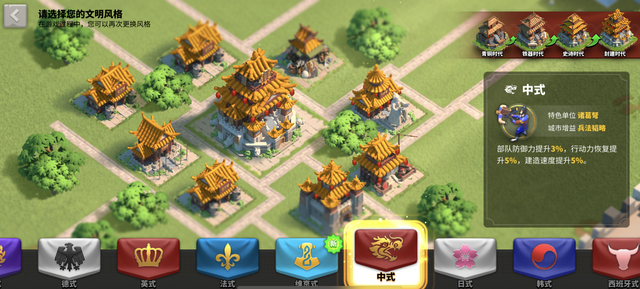 在万国觉醒游戏里,中式文明的加成是对全部队的防御提升,整体加成比罗马游戏。同时建筑速度提升5%这点非常实用,要知道后期一个建筑的升级都是几天时间起步。