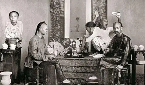 这是清朝官员正在抽鸦片的图片,照片中有六位男子,很显然站着的这位年纪尚小的少年或许只是烟馆的伙计,或者是家中伺候抽鸦片时的下人,其余围绕桌子而坐的五位官员均是抽鸦片的,这就是当时清朝官员的现状,因为鸦片的祸害他们几乎日日沉迷于鸦片,就快忘了国家忘了自己。