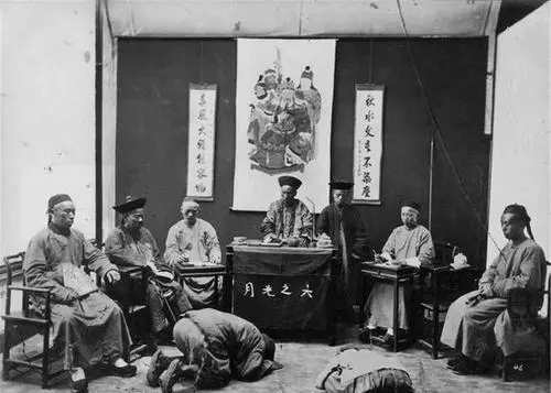 这是清朝末期办案的场景,从照片中我们可以看到已经没有了最初那些拿着木棍的衙役,只有坐着的县太爷和其他几位坐着的官人,在那时候很少有公平可言,若是你没有钱,那么无论你是原告还是被告都会被县太爷狠狠的训斥,这不仅仅是县太爷高高在上的地位体现,更是封建社会不平等的体现。