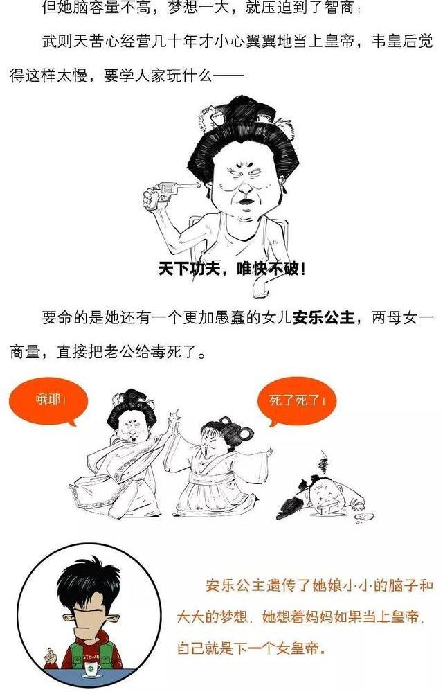 但“二混子”的漫画讲起来就非常的简单,有趣。武则天退位之后,韦后在上官婉儿、安乐公主的辅佐下,也玩起了专权。