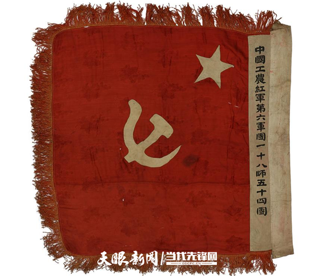 中国工农红军第六军团十八师五十四团军旗,长94厘米,宽96厘米,用鲜艳大红色有葡萄串暗纹的正方形丝绸制作,旗面中心有用白布剪贴的镰刀锤头图案,右上角还有用白布剪贴的一颗五角星,缝合的针脚比较均匀,是用缝纫机缝制。旗面三方边沿有大红色丝绦流苏,另一方边沿缝有宽2厘米的白布旗杆套,紧连旗杆套处有一条长94厘米、宽2厘米的白布条,上书“中國工农红軍第六軍團一十八師五十四團”十八个字,楷书。旗面破裂多处,并有少量的油污渍和小墨点。 1934年7月23日,中共中央和中革军委致电湘赣省委,令红六军团撤出苏区,转移到湘中创建新根据地。湘赣省委接到命令后,积极组织部队进行行军的有关准备工作;扩红工作也全面展开,3000多名地方武装转入红军主力。红六军团从6800多人扩充到9700多人,新增编18师54团,团长赵雄。红六军团18师54团军旗随之产生并开始使用。 1934年8月7日,任弼时、萧克、王震率红六军团踏上西征路。9月20日,红六军团到达贵州省黎平县。9月25日,红六军团在凯寨、孟优地区与国民党湘军独立第32旅、第55旅遭遇。由于湘军占据了周围山头高地等有利地形,并构筑了野战工事,红六军团连续组织几次进攻,准备冲破敌人的阻击,终因地形不利未能成功。此时,桂军第19师前来增援。由于敌情变化,红军决定连夜撤出战斗返回大广。26日凌晨,红六军团18师前卫翻越大广坳口,准备进至大广寨子时,被埋伏在坳口的桂军第24师突然袭击。刚经历了恶战,又连夜在崇山峻岭中长途行军的红军已十分饥饿疲惫,在前有桂军堵截、后有湘军追击的情况下,红六军团首长决定由18师第52、第54团担任掩护,主力迅速向西转移,进至鸟平寨一带宿营。红52、红54团接令后,从大广坳口北面的山脚向驻守坳口的敌军发起进攻。双方在黑夜中经过反复争夺,红军于天亮时终于攻上坳口,将桂军第24师全部击溃,为主力转移争取了时间。红52、红54团完成掩护任务,准备撤出战斗时,桂军一部突然从圭养沟抄袭红军后路,同时湘军也赶来增援。红52、红54团陷入重围,经战士们勇猛冲杀,红52团先冲出包围圈,追上了主力部队;红54团撤离在后,团长赵雄在战斗中牺牲,政委和两名营长负伤,阵亡近150人,红54团军旗也遗落在战场上。 战斗结束后,当地农民陈年贵邀约同乡伙伴到战场上捡拾东西时,发现了这面军旗,把它带回家中悄悄地保存起来。解放初期,解放军到当地剿匪时,陈年贵才将这面红军军旗拿出来,给大家观看,并讲述了这面军旗的来历。 1957年,遵义会议纪念馆文物征集组了解这一情况后,买了三尺新红布,与陈年贵交换了他收藏多年的军旗。 1994年,这面军旗经国家文物局专家组鉴定,确定为国家一级革命文物。