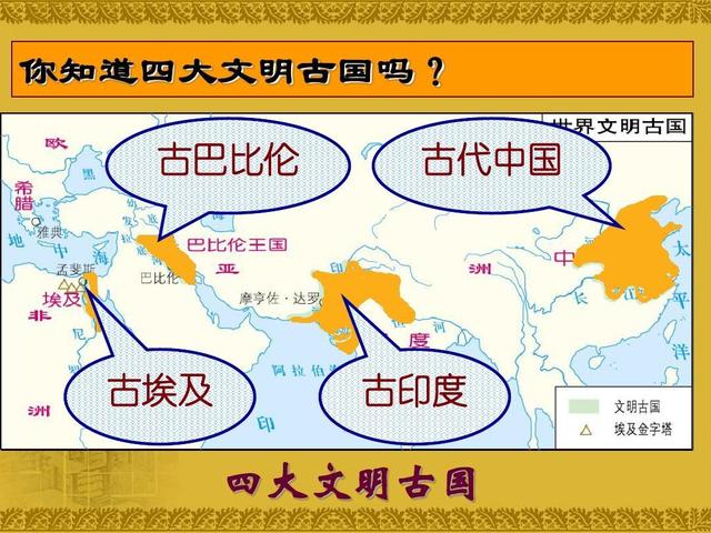 按他说来,这四个古国应该是:古代埃及文明、古代两河流域文明、古代印度文明和古代中国文明。这四个文明古国分布在亚欧大陆上的大河流域。