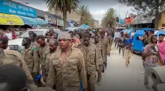 而在最近的埃塞俄比亚战场上,由于埃塞政府军战况不利,有大量军人被俘。这些军人被押送到提格雷州首府时,都是集中起来徒步行进的,密密麻麻的战俘排着长队行进,这个场面是非常令人震撼的,我们之前恐怕只有在历史画面中才会看到类似场景。