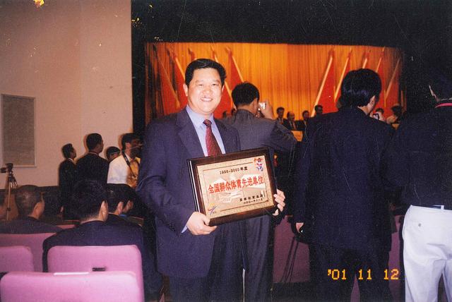 作者 褚衍海,于2001年11月出席全国群众体育先进单位和先进个人代表大会,领取全国群众体育先进单位奖牌。