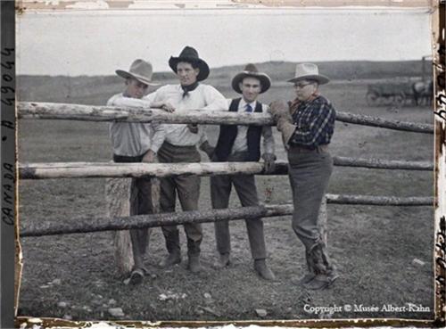 在20世纪20年代,美国正处于发展阶段,阿尔伯特·卡恩的团队到访美国,并且拍摄了美国西部的风景。照片中是四位美国牛仔,他们戴着标志性的牛仔帽,穿着牛仔靴,依靠在木栏杆上,对到访的摄影师非常感兴趣。