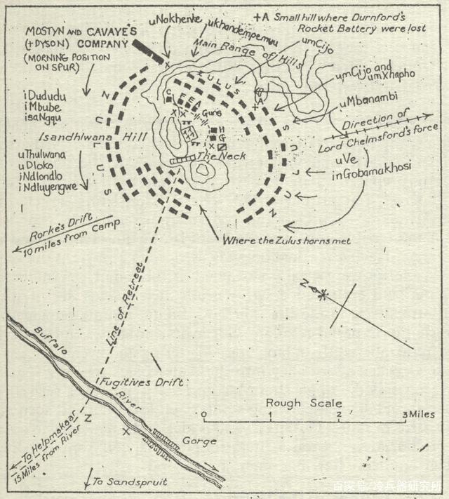 “他们并没有径直向前推进,而是逐步朝我们左侧行进,由于这里的地面上有着巨大的岩石,每个祖鲁人都以跑步从一块巨岩跑到另一块,这显然是要包抄我们……祖鲁人继续朝我们左侧行进,他们的战线此时已经像是环形,显然这是因为他们经常从左边抽调人员增援右边……祖鲁人的散兵动作非常漂亮,我只看到很少几个人中了弹。”