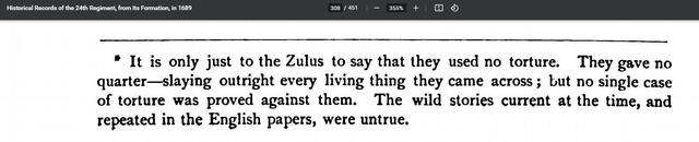 实际情形并非如此,由于当时欧洲报界对祖鲁人的描述往往过于天马行空,恩格斯在此基础上泛泛而谈时也自然会得出这种离奇结论。试举一例,英国报纸曾经生造出祖鲁人在严刑拷打英军战俘期间施加的种种神奇酷刑,以至于此战中的“头号苦主”英军第24步兵团在出版团史时都得费心澄清此类流言:此类事件纯属子虚乌有,祖鲁人素来是在战场上一杀了之不留活口,哪有拷打的闲心!