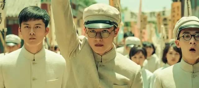 电影“五四运动”片段时,陈定秀、庐隐、王世瑛、程俊英这四位来自北京女子高等师范学校的女生是当时比较出名的“五四四公子”。她们上街游行的着装和其他学生是不一样的,剧组真实还原了“五四四公子”自己设计的统一着装。