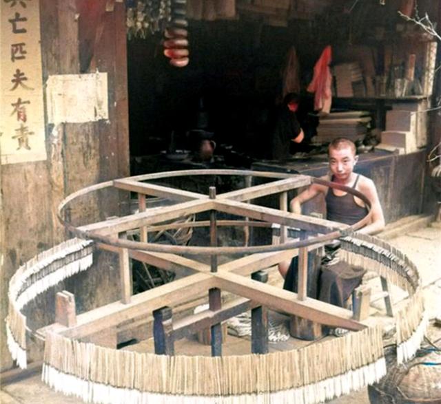 图为1940年的重庆一处毛笔作坊,门口对联上贴着“国家兴亡匹夫有责”,门前有一个小伙在做毛笔,那时候手工活可是很吃香的!