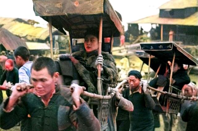 图为1940年的重庆挑夫,重庆是山城,日常生活用品等都需要挑夫挑上挑下,人若出行的话可以由挑夫抬着轿子行进!图中为几个抬着轿子行进的挑夫,上面坐着贵妇!