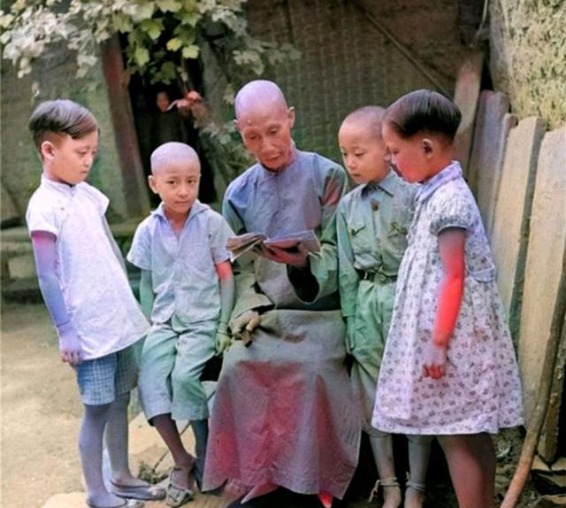 图为1940年的重庆,一个身穿长衣的老先生正在给小朋友们讲故事,小孩子都十分认真地听着!其中一名小女孩穿着花裙子,应该是家庭条件不错的小孩!