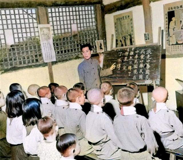 图为1940年的重庆一所小学,老师身穿中山装,孩子们穿着统一的校服,正在认真专注地听讲,黑板上写着“我爱中华”!