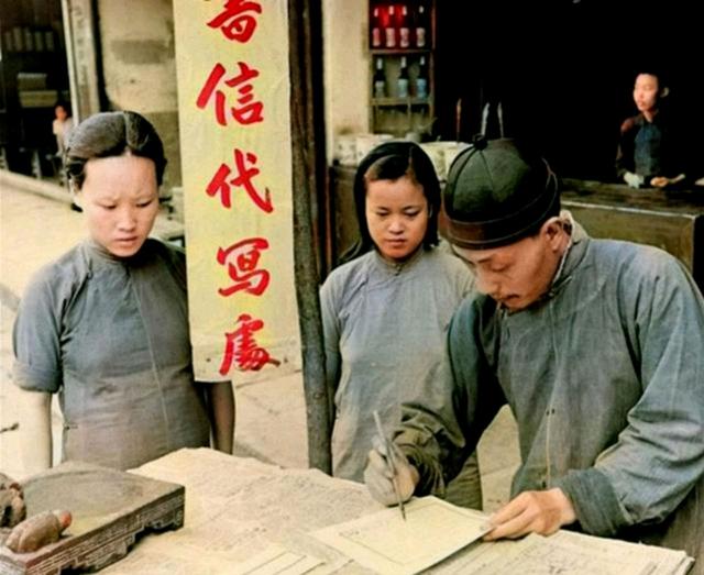 图为1940年的重庆一个“书信代写”摊,一名头戴帽子的先生正在给两名女子写“家书”!可能是写给远方的丈夫吧,那个时候很多家庭的男子都外出做事!