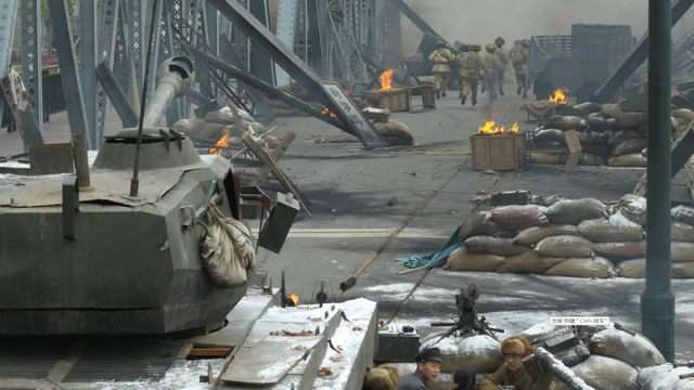 金汤桥战役剧照高希希对“金汤桥”的要求,是一条可以供人、坦克、装甲车一起通过的桥。领了任务,在横店明清宫后面的一块空地上,王刚带着美术部门花了一个月时间,搭建了这座桥。