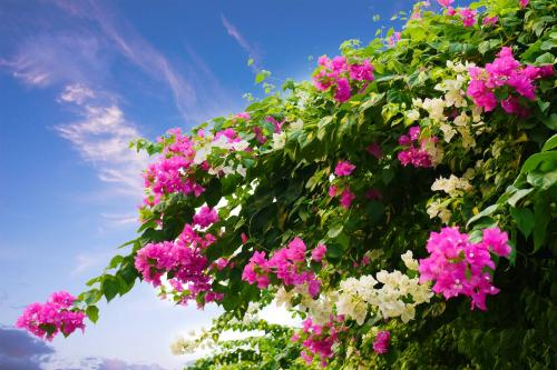 三角梅是梅花的一种,它的花瓣呈三角的形状,生长速度也是极快的,分枝能力很强,如果人们不进行人为的干预修剪,那么她很快就可以长成一片,蔓延在房顶上,也起到了很好的隔热防晒的效果。
