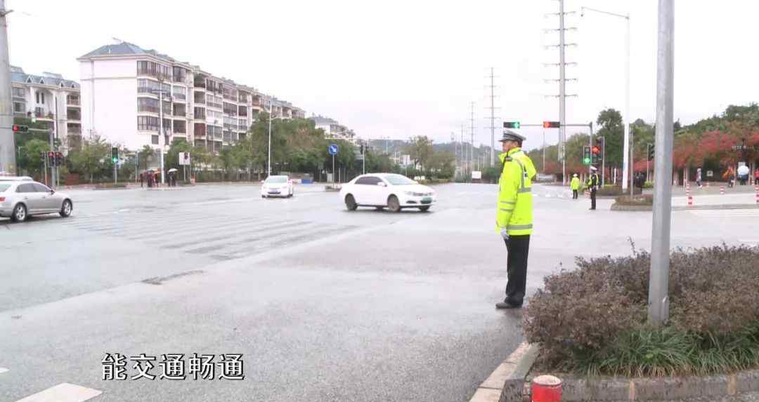 上午10点,天还在下雨空。在十字路口的安全岛上,一名交警密切关注着十字路口的交通情况,不断用手调整红绿灯。