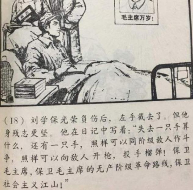 从那以后,随着舆论的发酵和他本人对这件事情的美化与篡改,他的“英雄事迹”流传深远。甚至出现在了小学课本里,文章中写道刘学保面对危险,坚定的走向敌人,嘴里喊着“不怕牺牲,排除万难。”这件事情真的使刘学保成了反对阶级斗争的大英雄。