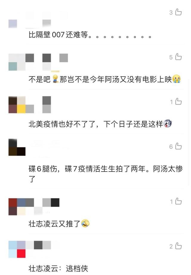 对此,不少网友纷纷吐槽,有网友直呼:“比隔壁007还难等”,也有网友很心疼阿汤哥,表示:“岂不是今年阿汤又没有电影上映”,看来网友们都对电影推迟上映一事感到不满。