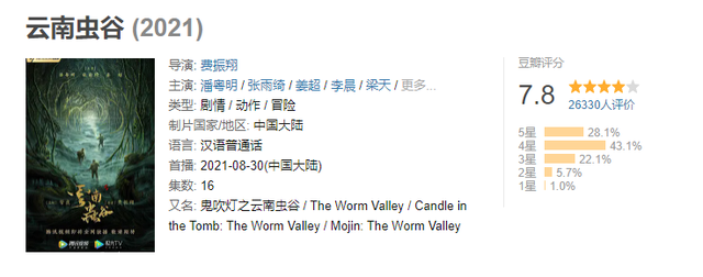 (自媒体/大米有文化)最近由潘粤明、张雨绮、姜超主演的《云南虫谷》上线了,豆瓣评分达到了7.8分。在平台上的收视率也是一路高攀,这部网剧是由管虎监制,是“鬼吹灯”系列的一个重要部分和高潮。但是从整体的质量来看,简直可以用惨不忍睹来形容,估计作为监制的管虎当时忙着拍别的大戏,没顾得上管吧。在豆瓣上打分的人可能是心存善良吧。