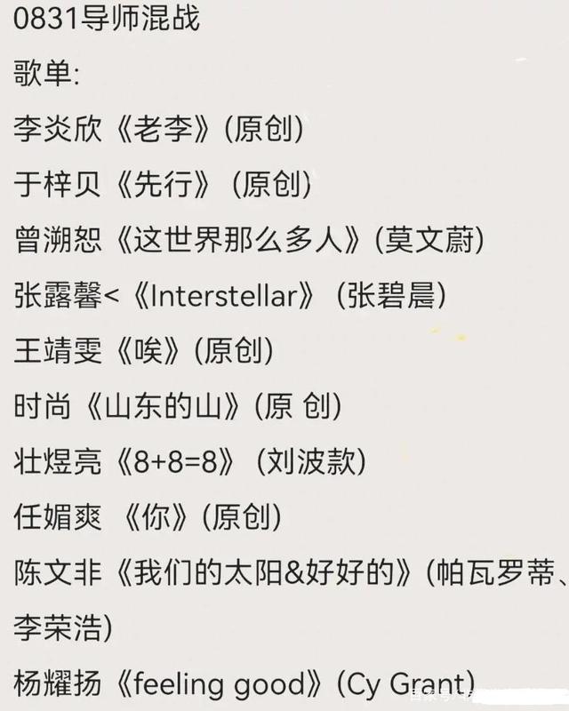 除此之外,8月31日和9月1日录制的导师混战结果也已经被曝光。从网曝的消息来看,我们首先能得到的信息就是大部分原创选手都被淘汰了,比如李荣浩战队的任媚爽和韦礼安,李克勤战队的时尚、那英战队的李炎欣、发条月亮、才旺罗布。