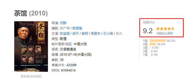 同时《代号·山豹》的导演是何群,他是中国第五代导演的代表,执导过多部堪称经典的电视剧。陈宝国主演的由老舍同名小说改编的电视剧《茶馆》的导演就是何群,这部电视剧豆瓣评分9.2。