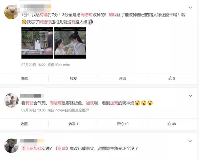 歌手周洁琼在这部作品中扮演了女三李妍,从拍摄通告上看,她的戏份多了为了采药不惜自我牺牲的情节,还疑似上了蓬莱岛。此时的剧情已经发展到了白热化的阶段,剧作方也联合播出平台推出了超前点播活动。可是,一集看下来没有几分钟主角的戏码,大多都是配角的戏码,如此严重注水的行为引起了网友们的强烈不满。