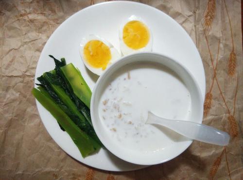 早餐:脱脂牛奶150ml+煮鸡蛋1个+麦片30g