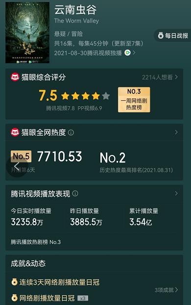 观众期待了一年多的鬼吹灯系列网剧《鬼吹灯之云南虫谷》终于上线,从这部剧首播后的播放数据来看,不愧是由潘粤明主演的大IP续作。猫眼平台显示,《云南虫谷》这部新剧上线仅仅上线6天,累计播放量就已经突破3.5亿。