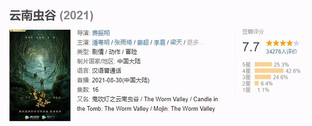在口碑方面,《云南虫谷》虽然不及《龙岭迷窟》,但是豆瓣7.7说明,大部分的观众对电视剧的内容都是积极、正面的评价。