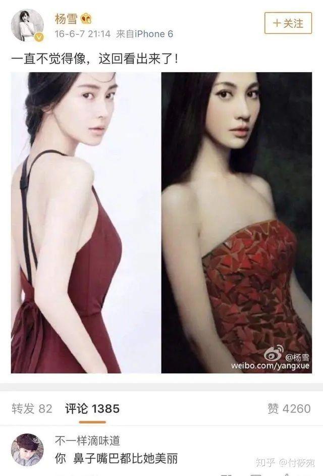 如今更与女星Angelababy杨颖极为神似,连杨雪本人也曾为此惊讶,还有一说,baby就是以杨雪作为整容范本。
