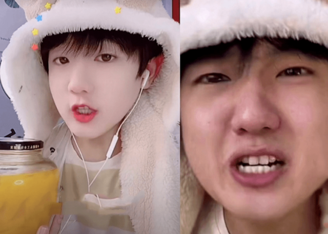 风小逸单凭一个“吃黄桃罐头”的视频,让他一战成名,自此之后每次开直播都会故意装成“伪娘”的气质,说话也喜欢用叠词,比如吃个桃桃、有点凉凉、拉丝的糖糖等,听多了这样的话就有些恶心。直播间里的风小逸,肤白貌美、唇红齿白,让人怎么看都觉得很精致,可有一次他开直播竟然忘开美颜了,让他的真实面目露了出来。