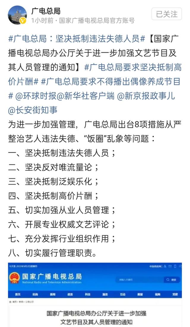 借此机会,国家主管部门重拳出击,势在扭转目前娱乐圈的无序发展。其中作为媒体主管部门的广电总局,曾在9.2日连发多条重磅措施。