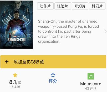 在IMDb平台,《尚气与十环传奇》则拿下了8.1分,目前评分人数已超1.5万人,评分具有参考性。
