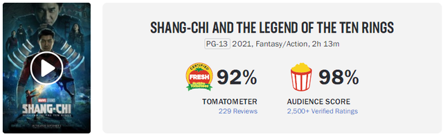 口碑也收获了良好的成绩,烂番茄新鲜度为92%,观众满意度为98%,而《黑寡妇》的烂番茄新鲜度为79%,观众满意度为91%,这一部新作的口碑明显好于《黑寡妇》。