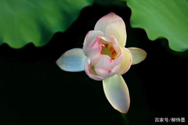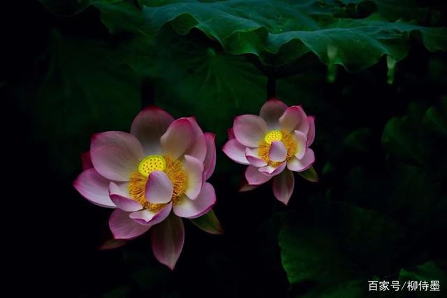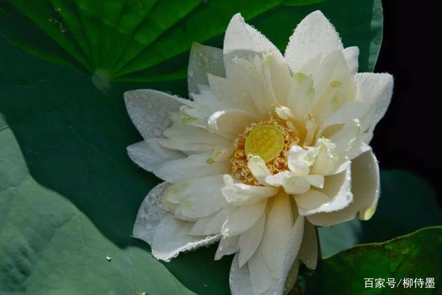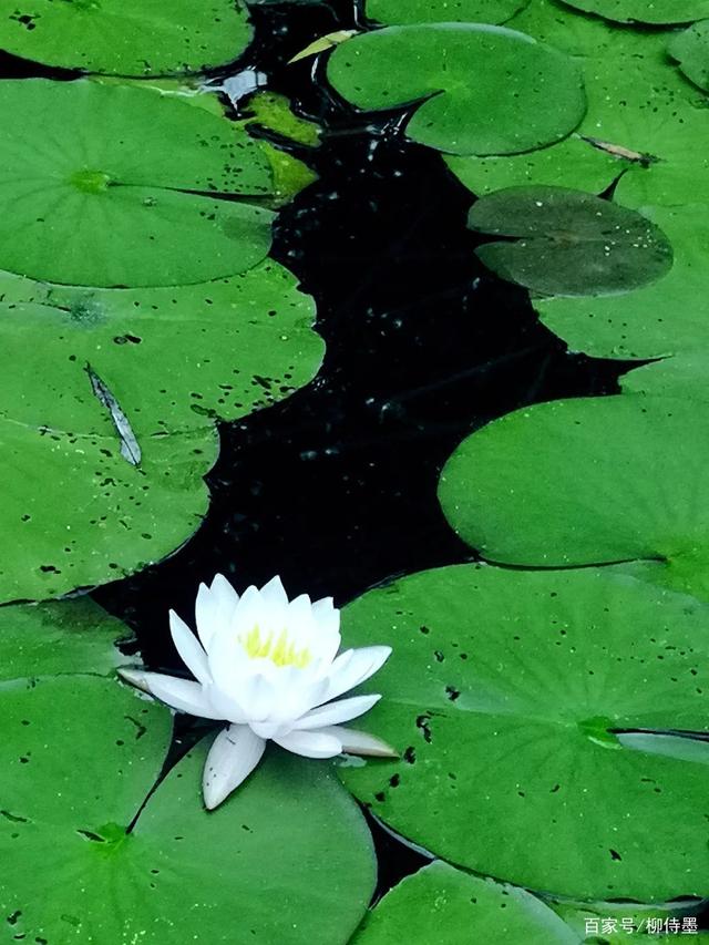 绿色的荷叶,白色的花朵,黑色的水面。虽然看上去光线略微平淡了一些,但是利用色彩差距,也能达到醒目的效果。