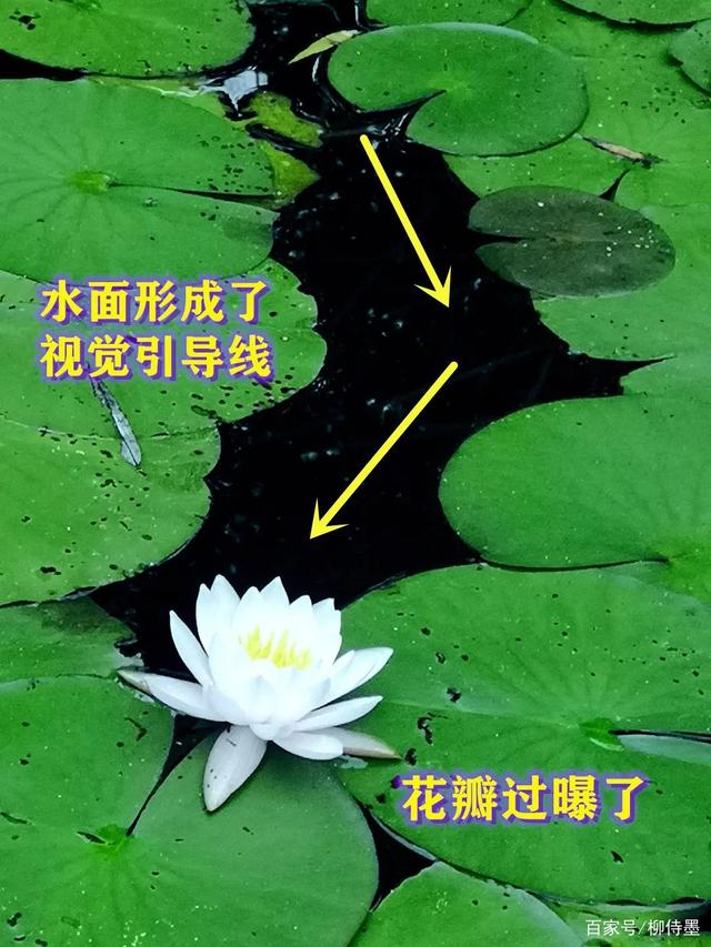 顺着荷叶叠加的走向,叶子中间隔出来的黑色水面,充当了视觉引导的线的作用,顺着水面,可以很轻松地看到白色的莲花。