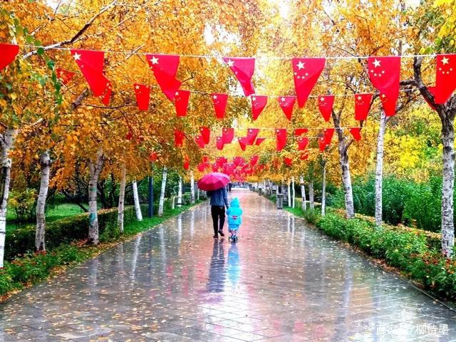 红色雨伞和路上的红旗,就这么重叠在一起了……