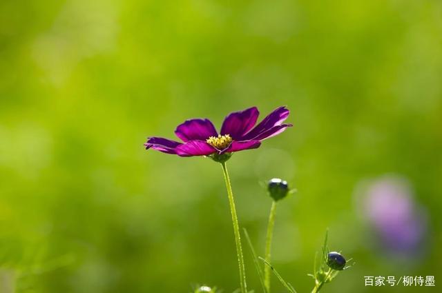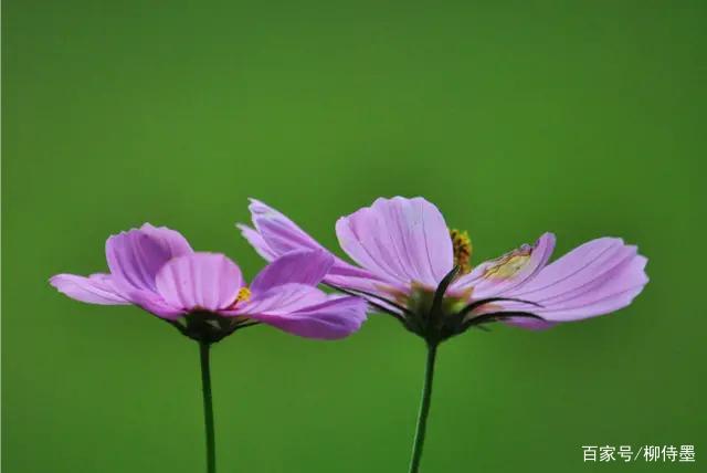 这张照片的摄影主体是大波斯菊,也就是俗称的“格桑花”。主体简洁,背景干净,花瓣上的纹理也很清晰。用绿背景衬托紫红色的花儿,颜色对比分外鲜明。