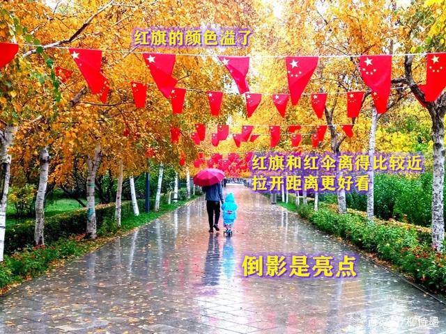 如果不想让红旗和雨伞出现“景物重叠”,我们在拍摄的时候,可以调整一下拍摄角度。