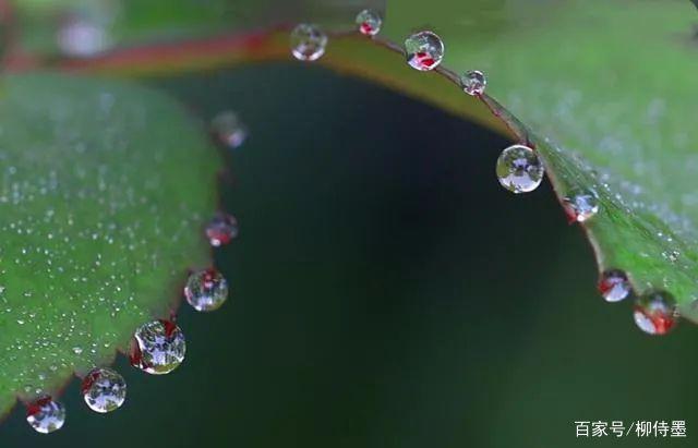 这张照片拍摄的挺精致的。两片叶子的边缘挂着晶莹的水珠,就好像是两串漂亮的项链。