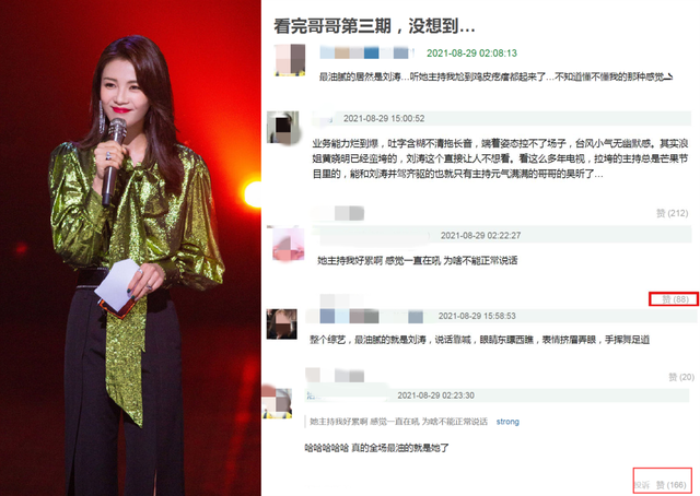 从各大平台的网友评论来看,大家对刘涛的主持方式都不太喜欢,不是专业主持出身的刘涛在主持过程中出现咬字不清晰,拖长音,节奏太慢,并且主持的时候显得非常用力,大概是因为一直在做主播卖货的原因,刘涛的主持风格非常像在是吆喝卖货,有一种扯着嗓子喊的感觉,这些点加在一起引发了网友群嘲。