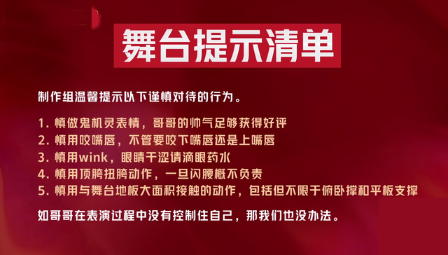 有了某哥哥综艺的前车之鉴,《披荆斩棘的哥哥》的节目组为了防止哥哥们在镜头前耍帅过于油腻,所以节目组在公演之前还贴出了“舞台提示清单”,让哥哥们不要对着镜头打wink,咬嘴唇,做过多的地板动作等等,就是为了防止画面过于油腻,引起观众不适~